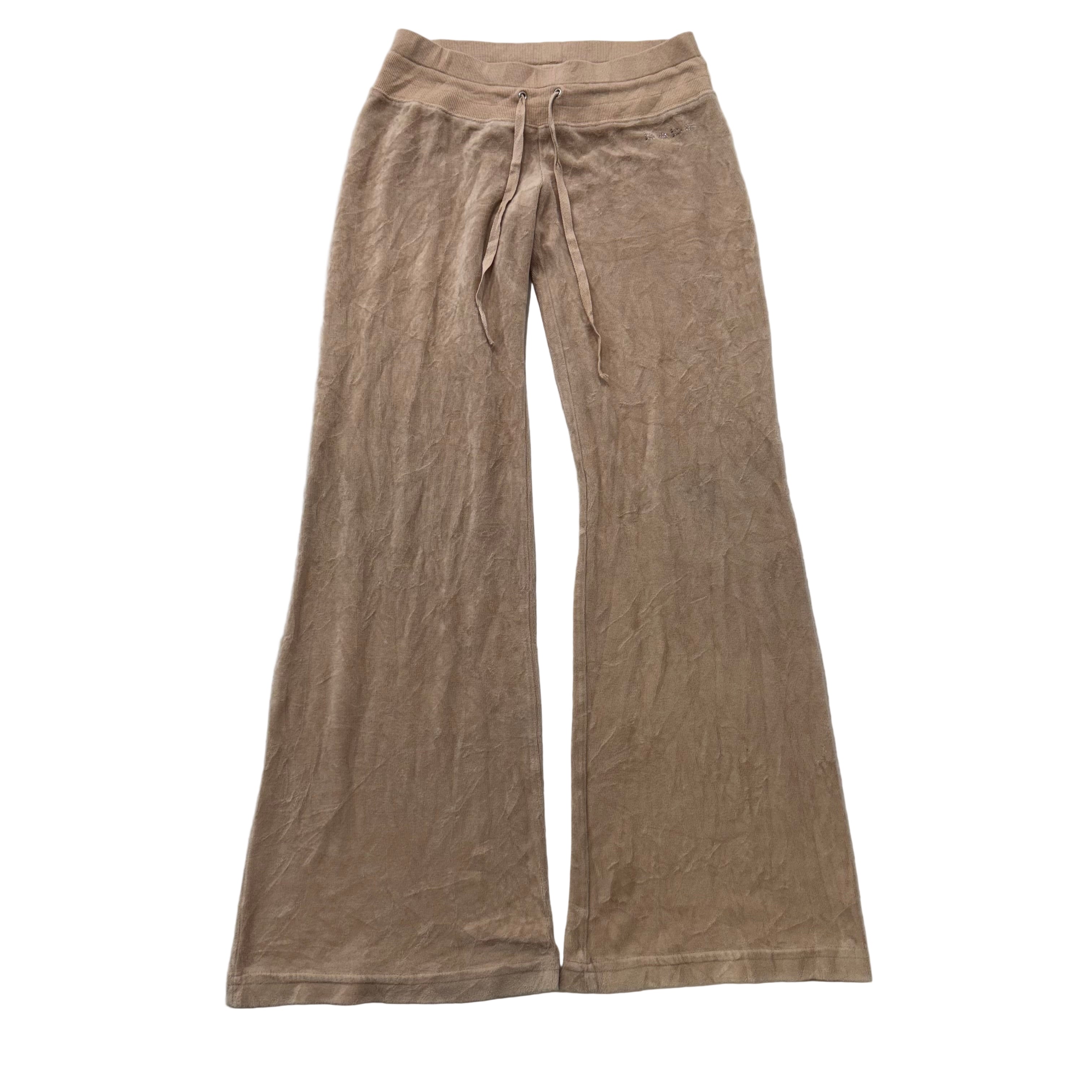 Y2K Juicy Couture brown velour pants featuring a gold rhinestone heart design at the hip. Soft plush velour, low-rise waist, and straight-leg fit — a clean and classic early-2000s Juicy staple.