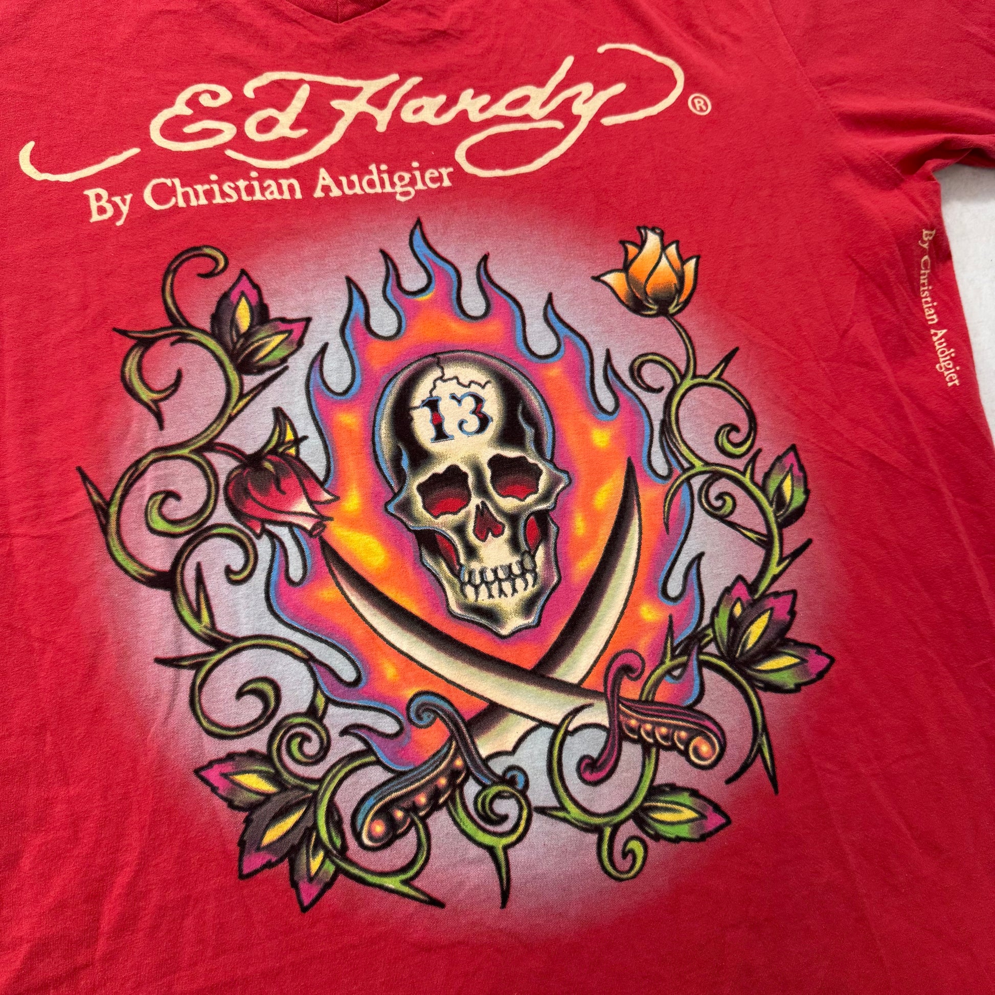 ED Hardy By Christian Audigier “Flame Pirate Skull” Red Graphic T-Shirt Features Bold Pirate Skull Artwork With Flame Details And A Striking Y2K Streetwear Aesthetic. Designed With A Comfortable Crew Neck And Relaxed Fit For Everyday Casual Wear, This Tee Is New Without Tags. Perfect For Pairing With Jeans Or Layered Outfits, Adding Signature Ed Hardy Style And Edge To Your Wardrobe.