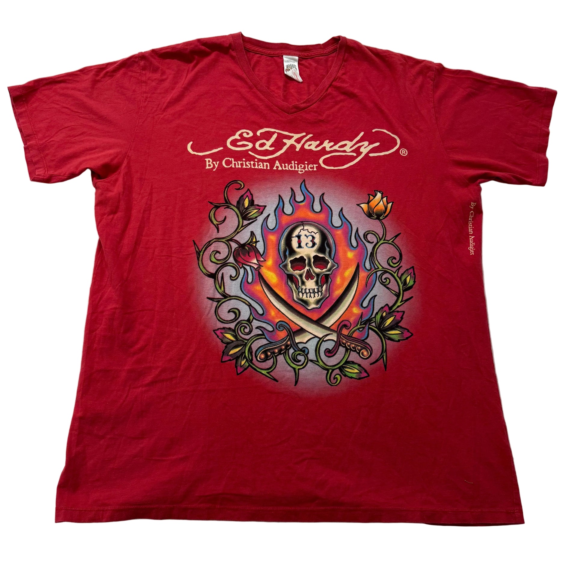 ED HARDY by Christian Audigier "Flame Pirate Skull" Red Graphic T-Shirt Size XXL