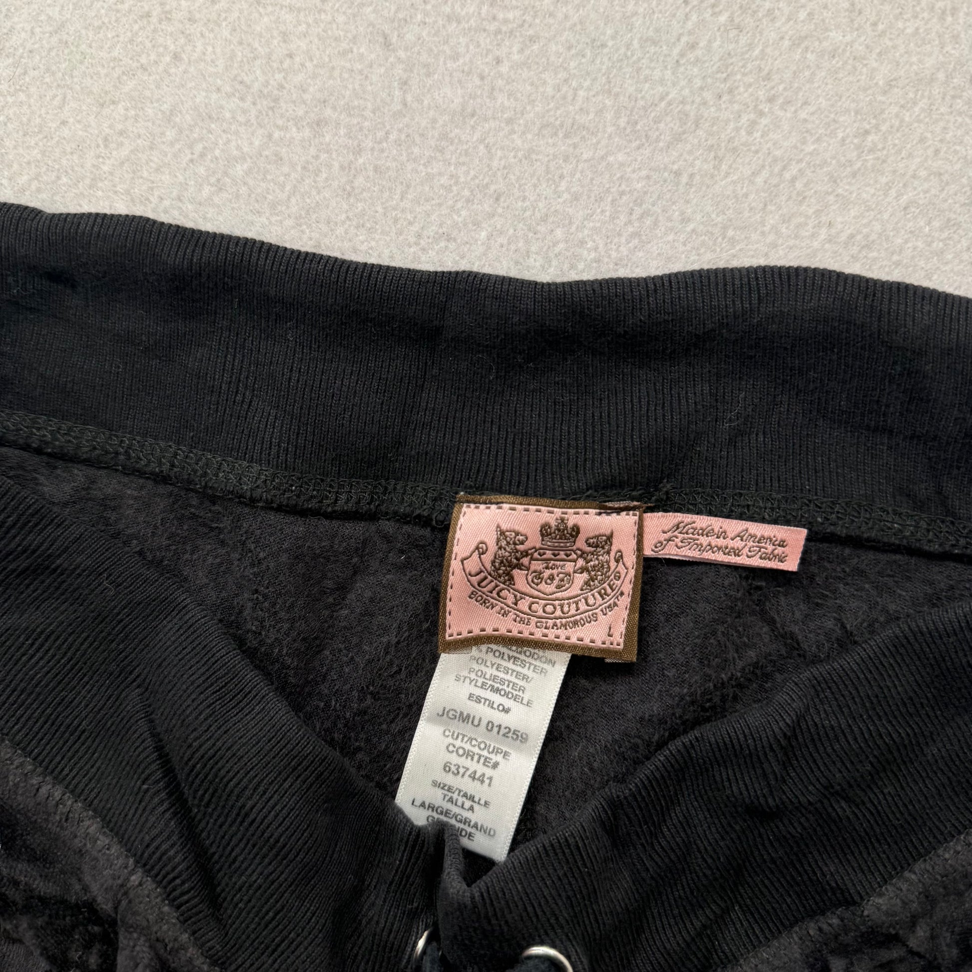 Juicy Couture Vintage Women’s Black Velour Flared Track Pants in Size L, featuring a classic Y2K-inspired silhouette with a flattering flared leg. Crafted from soft, plush velour fabric for cozy comfort and stylish loungewear vibes. Perfect for lounging, casual streetwear, or pairing with matching velour hoodies for a coordinated outfit. Pre-Owned Excellent condition and ready to wear.