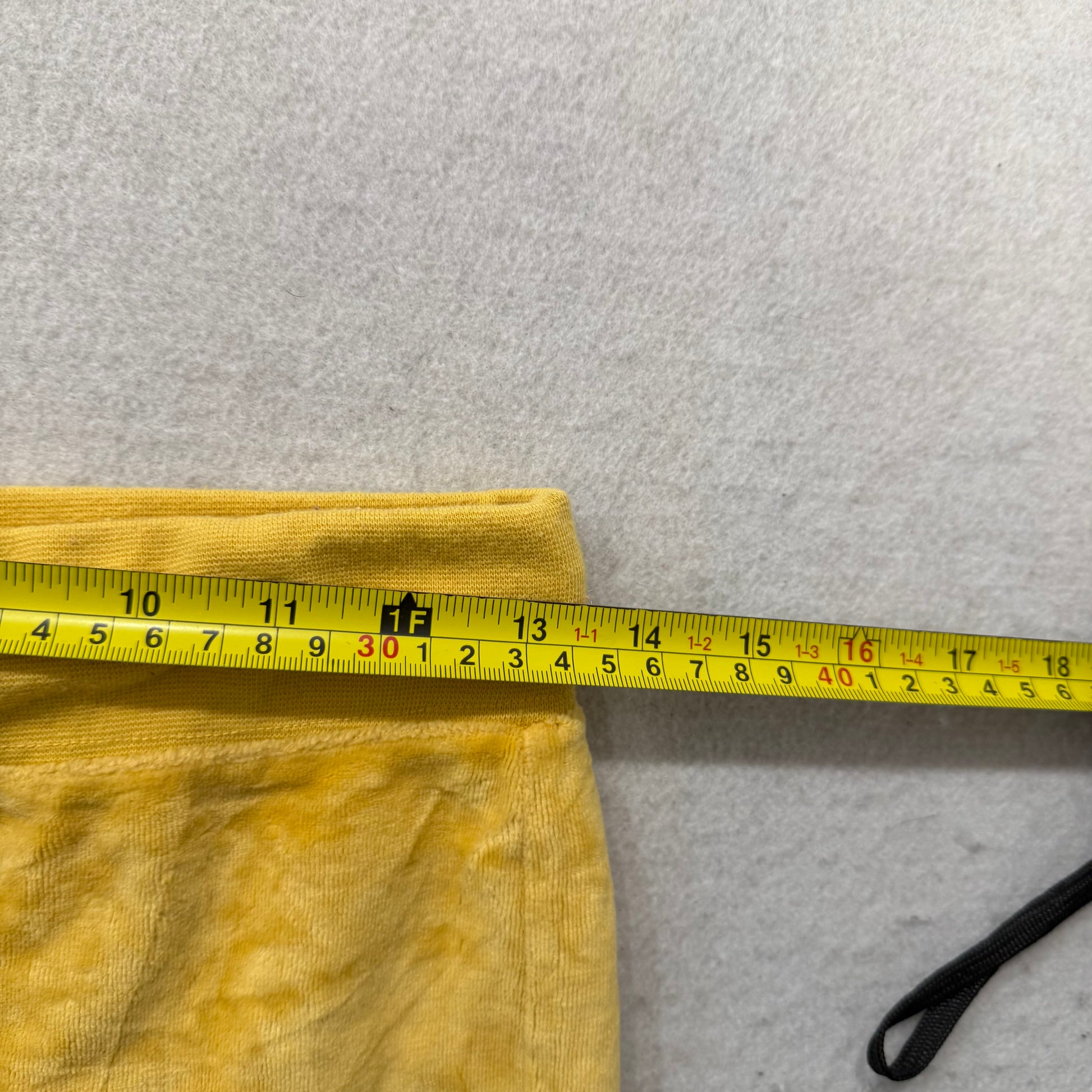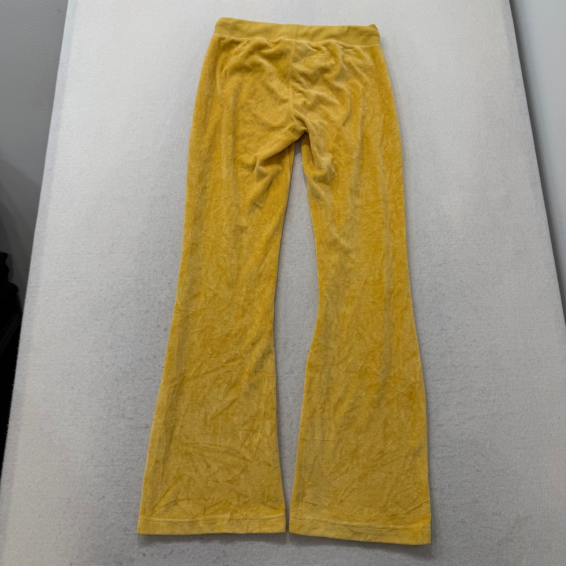 Juicy Couture Vintage Women’s Mustard Yellow Velour Flared Track Pants in Size S, featuring a bold Y2K-inspired silhouette with a flattering flared leg. Crafted from soft, plush velour fabric for cozy comfort and standout style. The rich mustard hue adds a vibrant touch, perfect for pairing with matching hoodies or casual tops. Ideal for lounging, casual outings, or trendy streetwear looks. Pre-Owned Excellent condition and ready to wear.