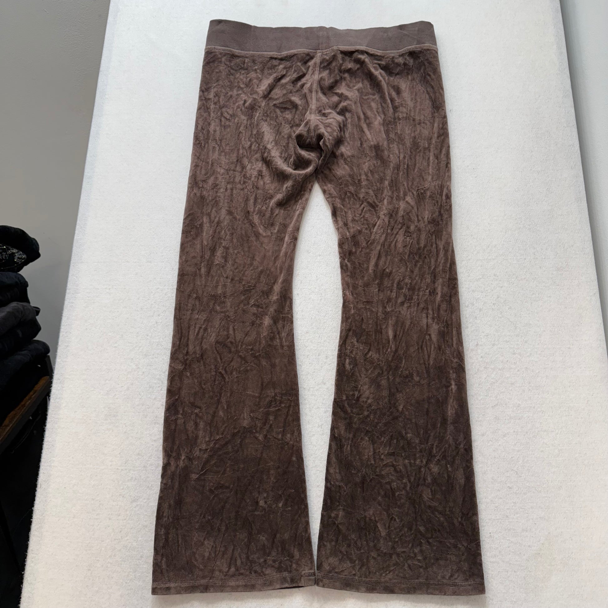 Juicy Couture Vintage Women’s Brown Velour Flared Track Pants in Size L, featuring a classic Y2K-inspired silhouette with a flattering flared leg. Crafted from soft, plush velour fabric for cozy all-day comfort. Designed with signature crown logo detailing for a stylish, iconic touch. Perfect for lounging, casual streetwear, or pairing with matching velour hoodies. Pre-Owned Excellent condition and ready to wear.