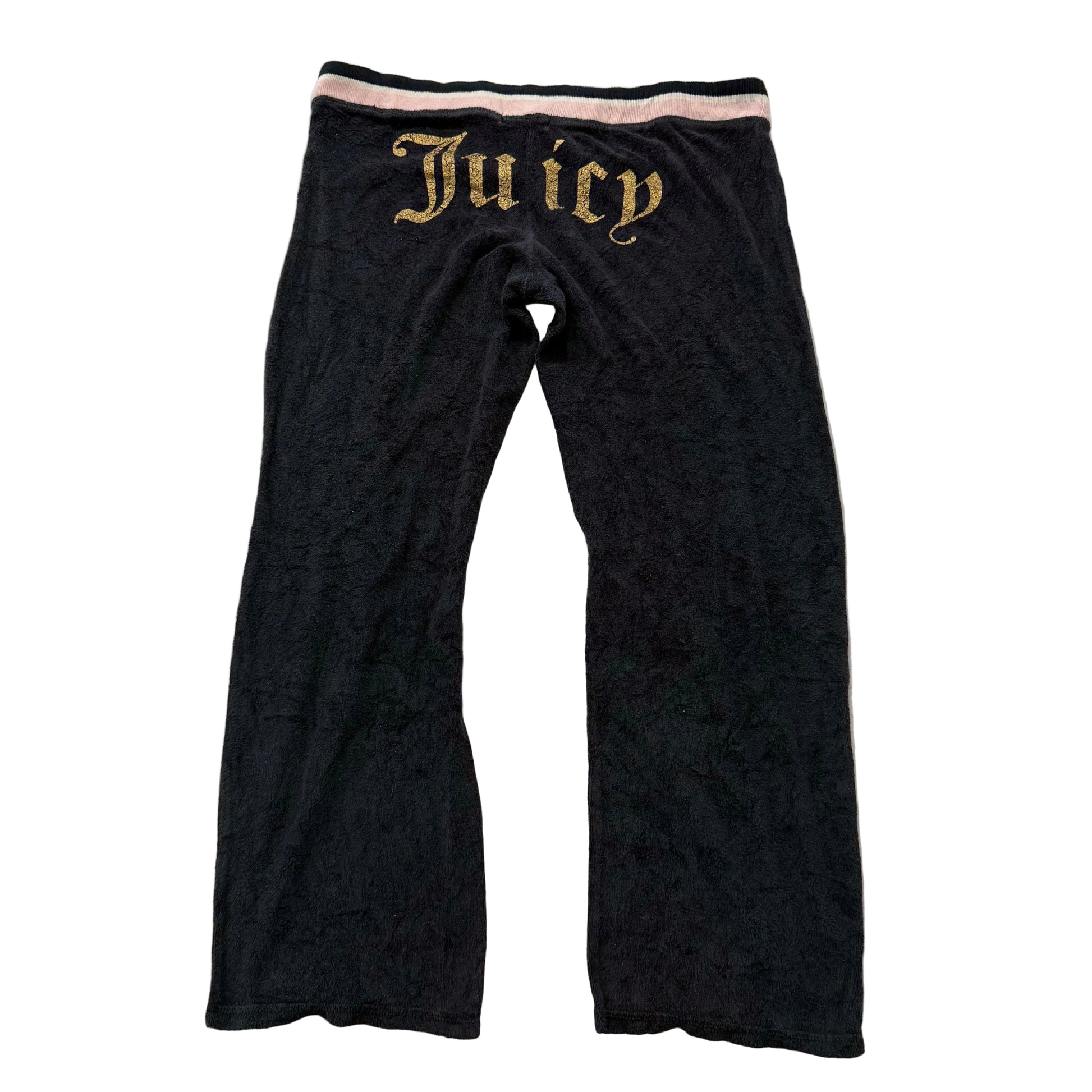 Juicy Couture Women’s Black Terrycloth Straight Leg Track Pants in Size S, featuring a low-rise fit for a classic early 2000s-inspired look. Crafted from soft terrycloth fabric that offers lightweight comfort and a cozy feel. Designed with a straight leg silhouette for a clean, relaxed style that pairs effortlessly with tees or matching track tops. Perfect for lounging, casual wear, or sporty streetwear outfits. Pre-Owned Excellent condition and ready to wear.